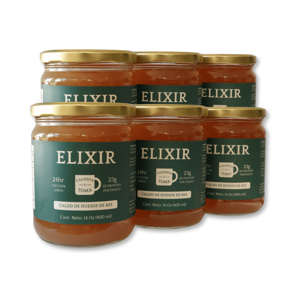 Elixir es un caldo concentrado y gelatinoso, cocinado durante 24 horas con huesos de res. Es rico en colágeno natural, proteínas y aminoácidos. No contiene sal, especias ni conservadores: es un producto puro y curativo. A diferencia de otros caldos, Elixir tiene más proteína (23 g por 400 ml), más colágeno y, por lo tanto, más beneficios para tu cuerpo.